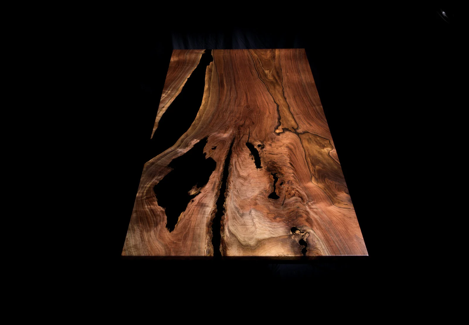 Locally salvaged Oregon Black Walnut and jet-black epoxy resin. This is the style of table that Blacktail Studio is most know for. This is far from the traditional “river table” with two pieces of wood set indiscriminately next to each other. The Blacktail Signature series sources one oversized slab with natural voids and cracks that can highlight the grain and color of the walnut without overpowering the beauty of the natural wood.