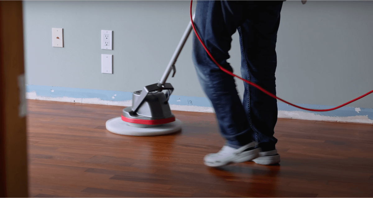 Once the edges were cut in, Avedis used a heavy-duty floor maintainer with a red pad to buff the rest of the floor. The weight of the heavy-duty buffer generates heat and helps drive the finish deep into the wood. However, he pointed out that you need to be cautious with this buffer. If you let it sit on one spot for too long, the floor might get burnished, making that area look different from the rest.